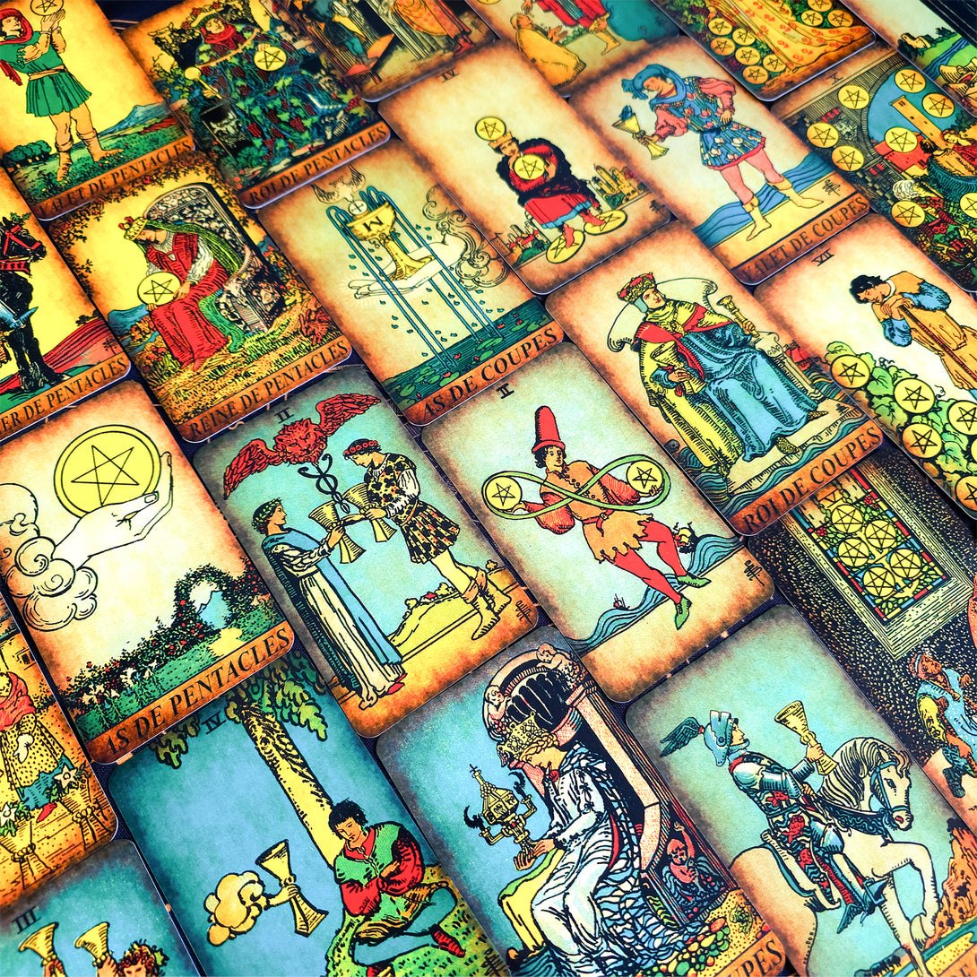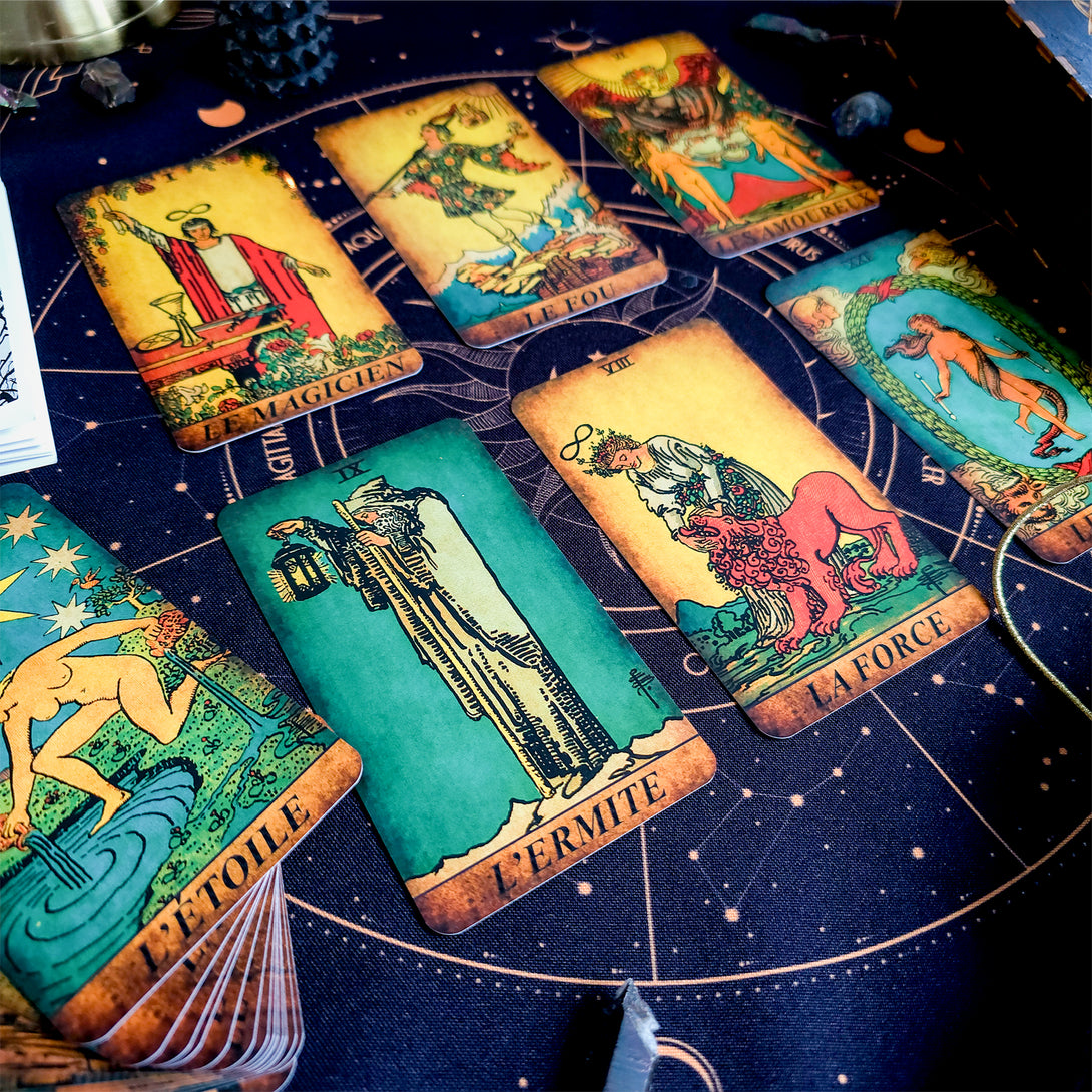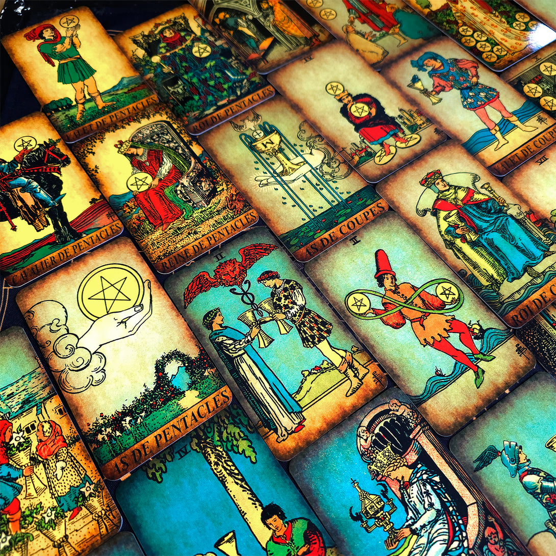 Deck: Complete 78 cards (22 Major Arcana, 56 Minor Arcana) — French text