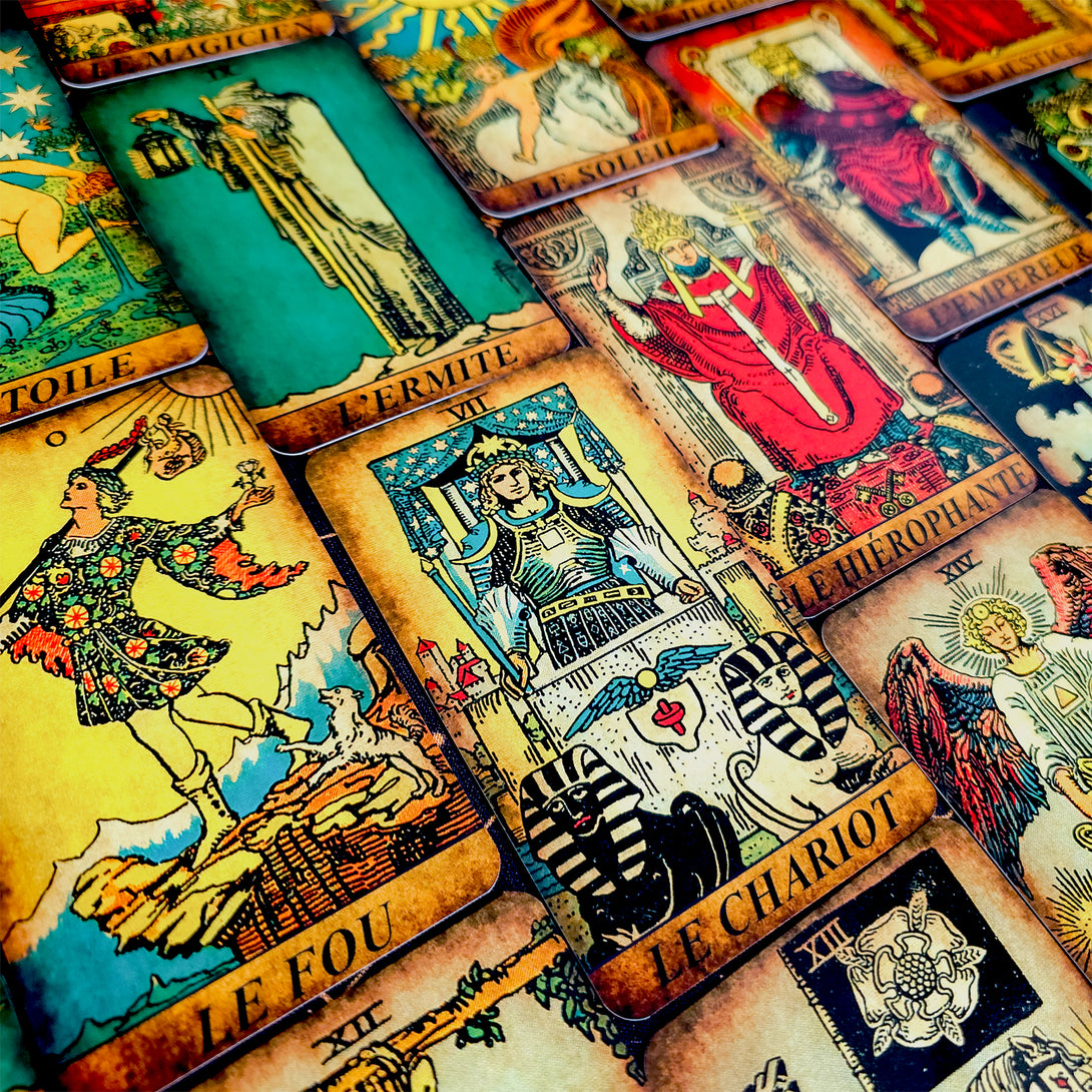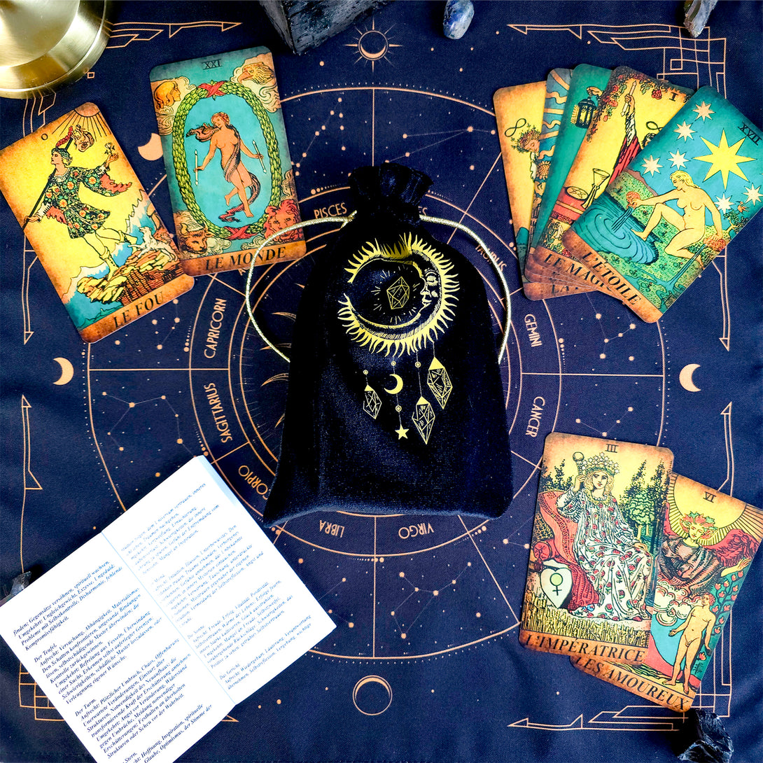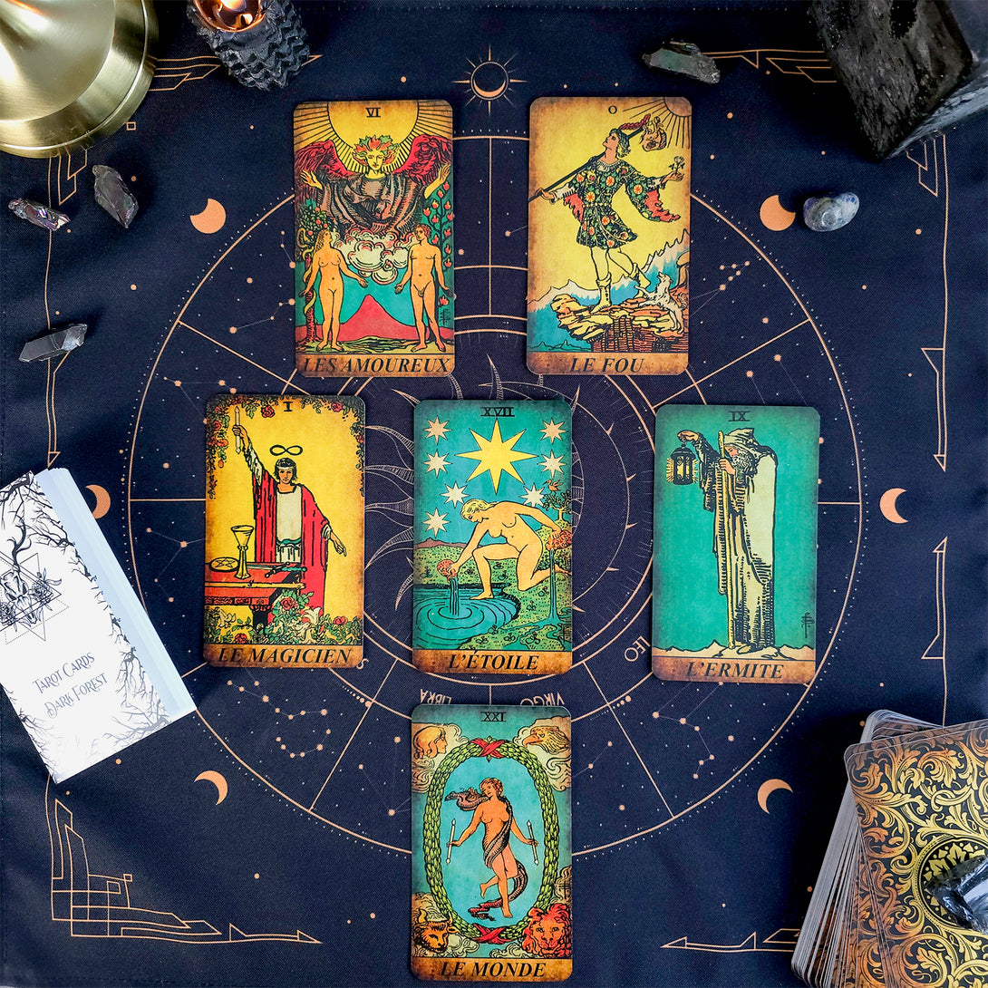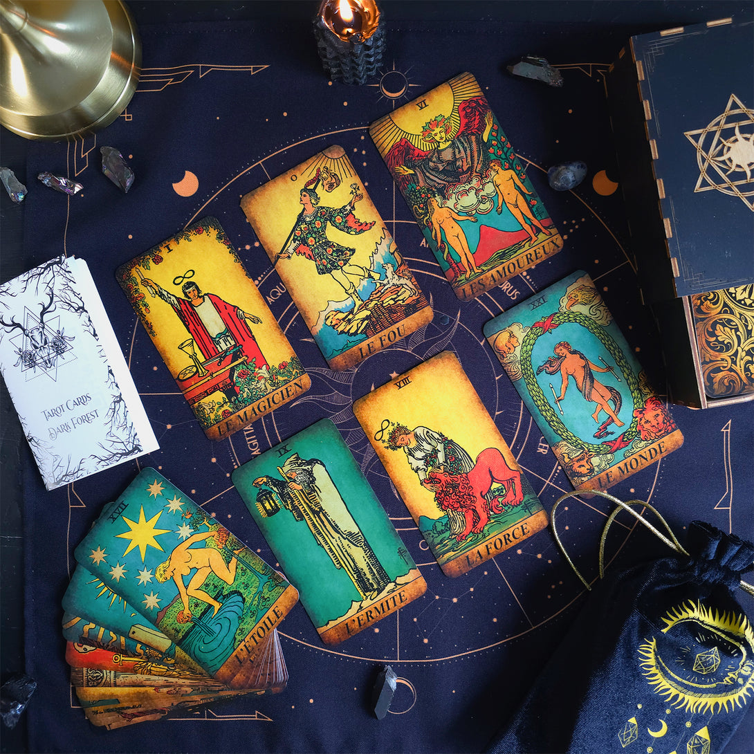 Deck: Complete 78 cards (22 Major Arcana, 56 Minor Arcana) — French text
